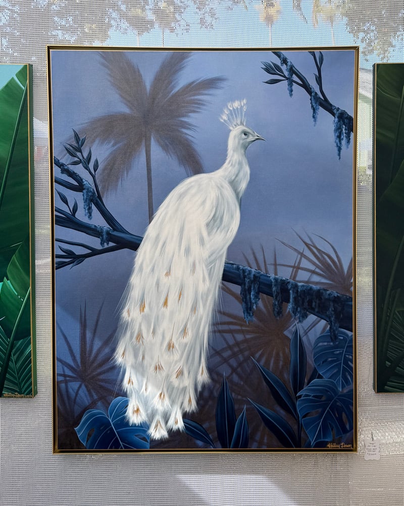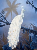 “Angel” was inspired by a white peacock I had the pleasure of photographing at the Atlanta zoo. She truly looked angelic, almost too beautiful to be real. This piece is completed in acrylic paint with an iridescent finish over the background, which truly makes the bird stand out. There are also genuine 24k gold leaf details wove into her tail feathers.
